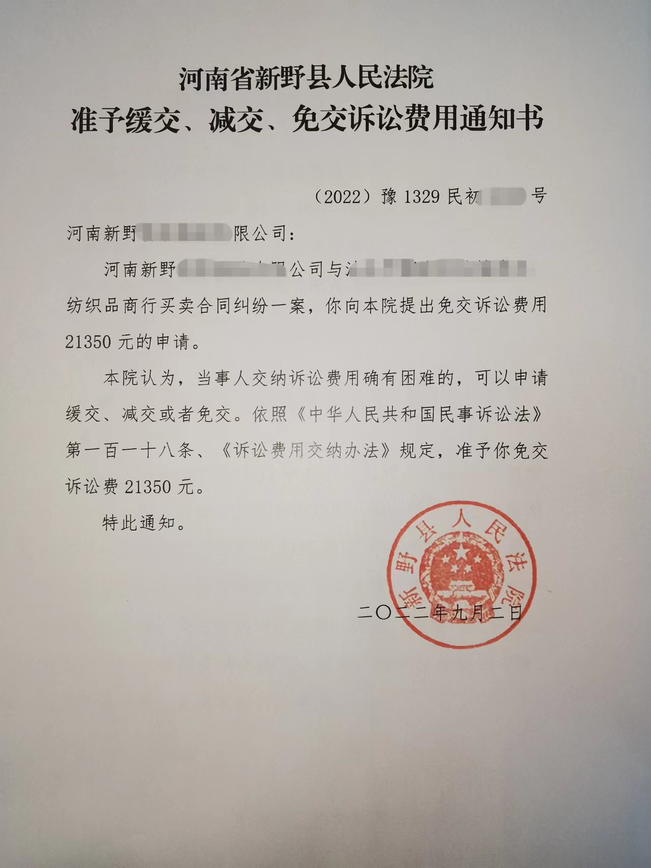 近期,新野县法院审理某纺织公司起诉的一起涉企案件过程中,因被告出现企业注销、股东死亡等情况,该企业向法院提出撤诉申请,并请求免交案件诉讼费用。为帮助该纺织企业渡过难关,新野县法院在接到申请后,详细了解企业经营现状,对原告的免交诉讼费申请进行认真审查。结合企业发展及疫情等原因后,决定予以免交诉讼费2万余元。
