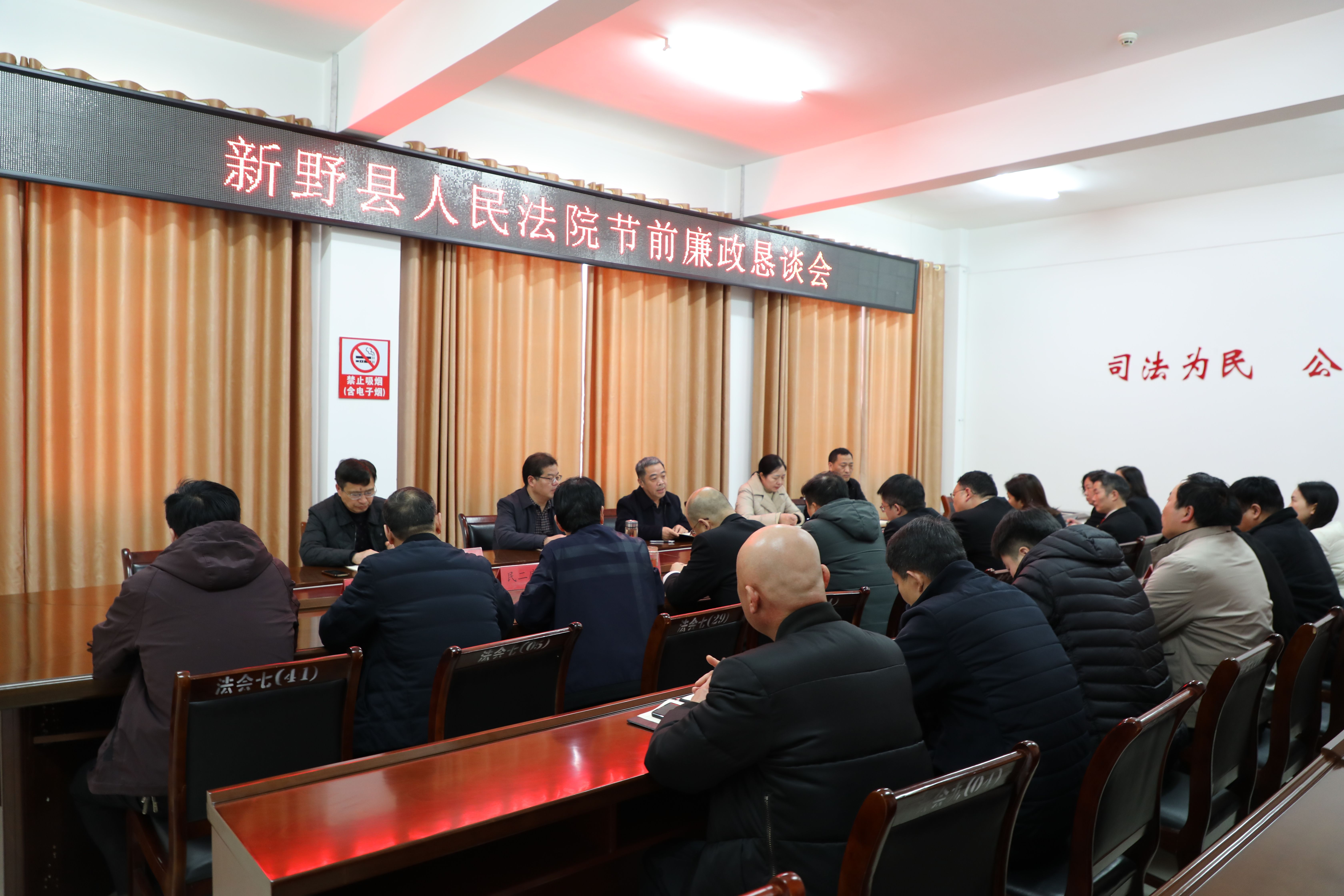 春节将至,年关亦是“廉关”。为深入贯彻落实中央八项规定及其实施细则精神,持续推动违规吃喝问题专项整治走深走实,2026年2月13日,河南省新野县人民法院召开节前廉政恳谈会,为干警敲响廉洁警钟,筑牢思想堤坝,确保节日期间风清气正。院班子成员及各部门负责人参会。