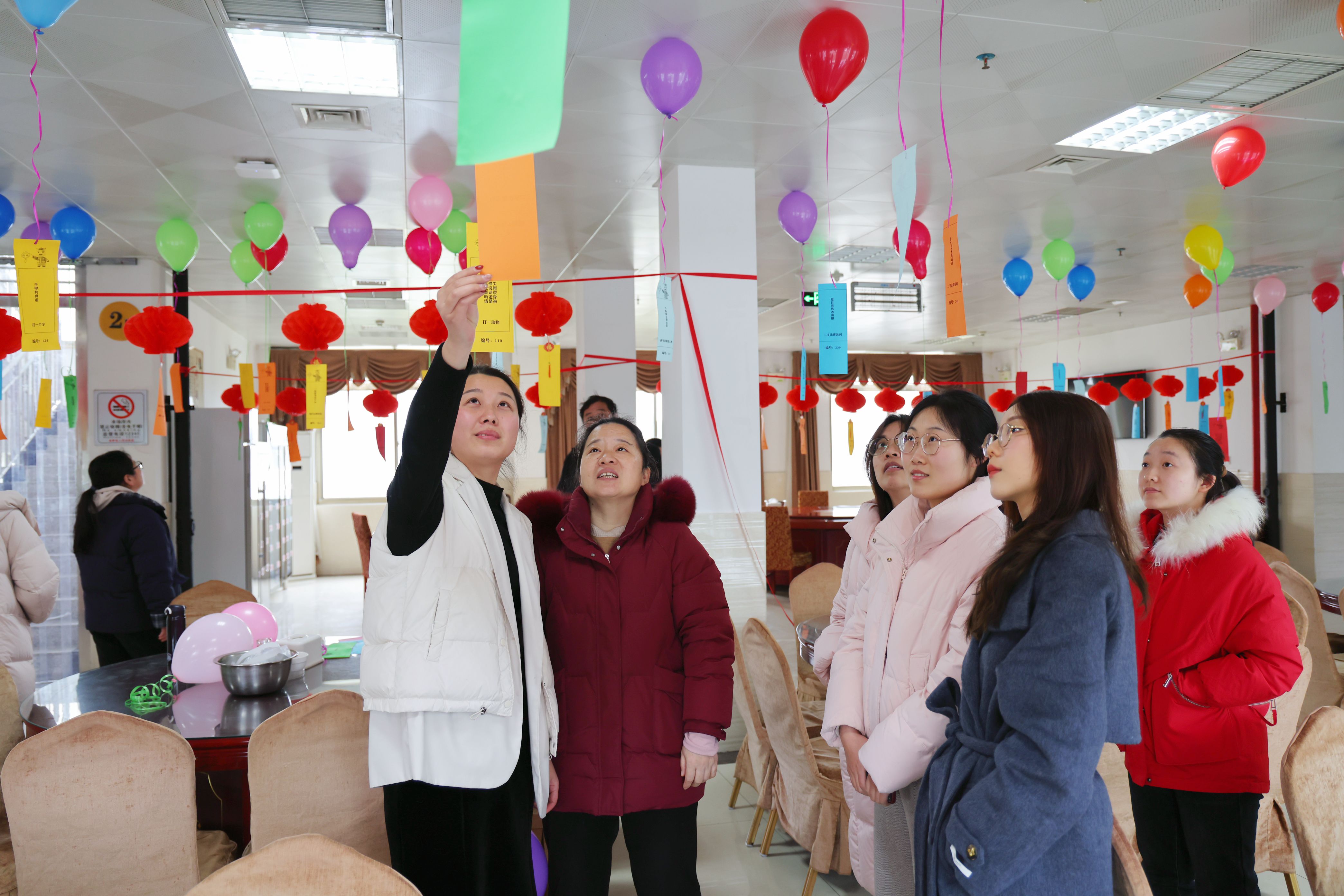 活动现场喜气洋洋,红灯笼和五彩气球点缀其间,下面悬挂着写满谜题的彩色纸条,节日氛围浓厚热烈。本次活动共准备了200余条灯谜,内容涵盖法律知识、民俗文化、成语典故、生活常识等多个领域。既有贴合法院特色的“卷帘望断北飞雁,打一民法典名词”等法治谜题,也有妙趣横生的“骏马奔驰在草原,打一成语”等趣味谜语。干警们或凝神思索,或热烈讨论,现场气氛活跃,欢声笑语不断。